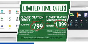 The Clover POS Bundle is now at a low price of $799 rather than $1,299 and the Clover Mini Wifi Bundle is now $1,099 rather than $1,648! These offers are good until March 31st so take advantage of this while it's still available! Contact support for details.